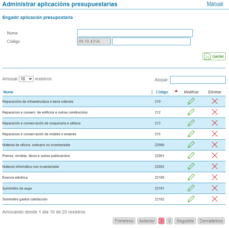 Esta é a pantalla de mantemento de Aplicacións presupostarias.